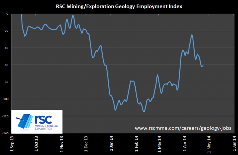 We didn’t report on the RSC Mining and Exploraiton Geology Employment Index over the Easter weekend, but over the last 2 weeks there has been a 9% drop in the number of advertised positions. Feel free to leave comments below.